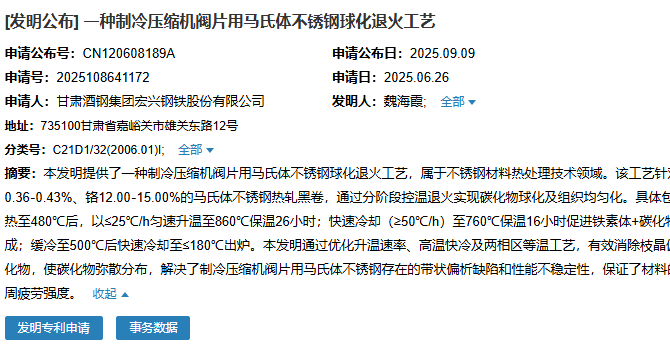 時間:09/10/2025 01:25:369月9日,甘肅酒鋼集團宏興鋼鐵股份有限公司成功申請一項名為“一種制冷壓縮機閥片用馬氏體不銹鋼球化退火工藝”專利,申請公布號為CN120608189A,申請日期為2025年6月26日。