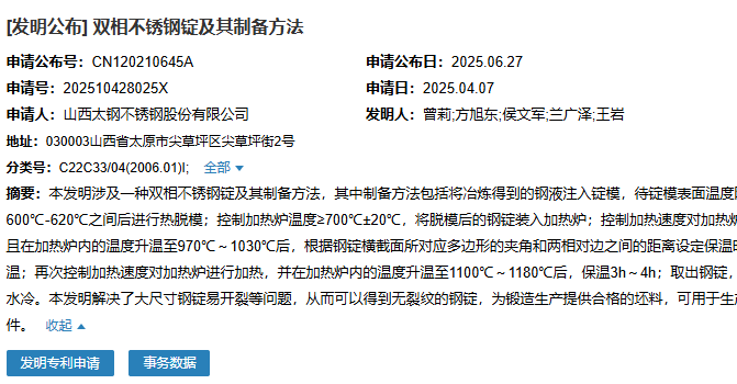 時間:06/27/2025 03:10:342025年6月27日,山西太鋼不銹鋼股份有限公司成功申請一項名為“雙相不銹鋼管坯及其制備方法”專利,申請公布號為CN120210688A,申請日期為2025年4月7日。